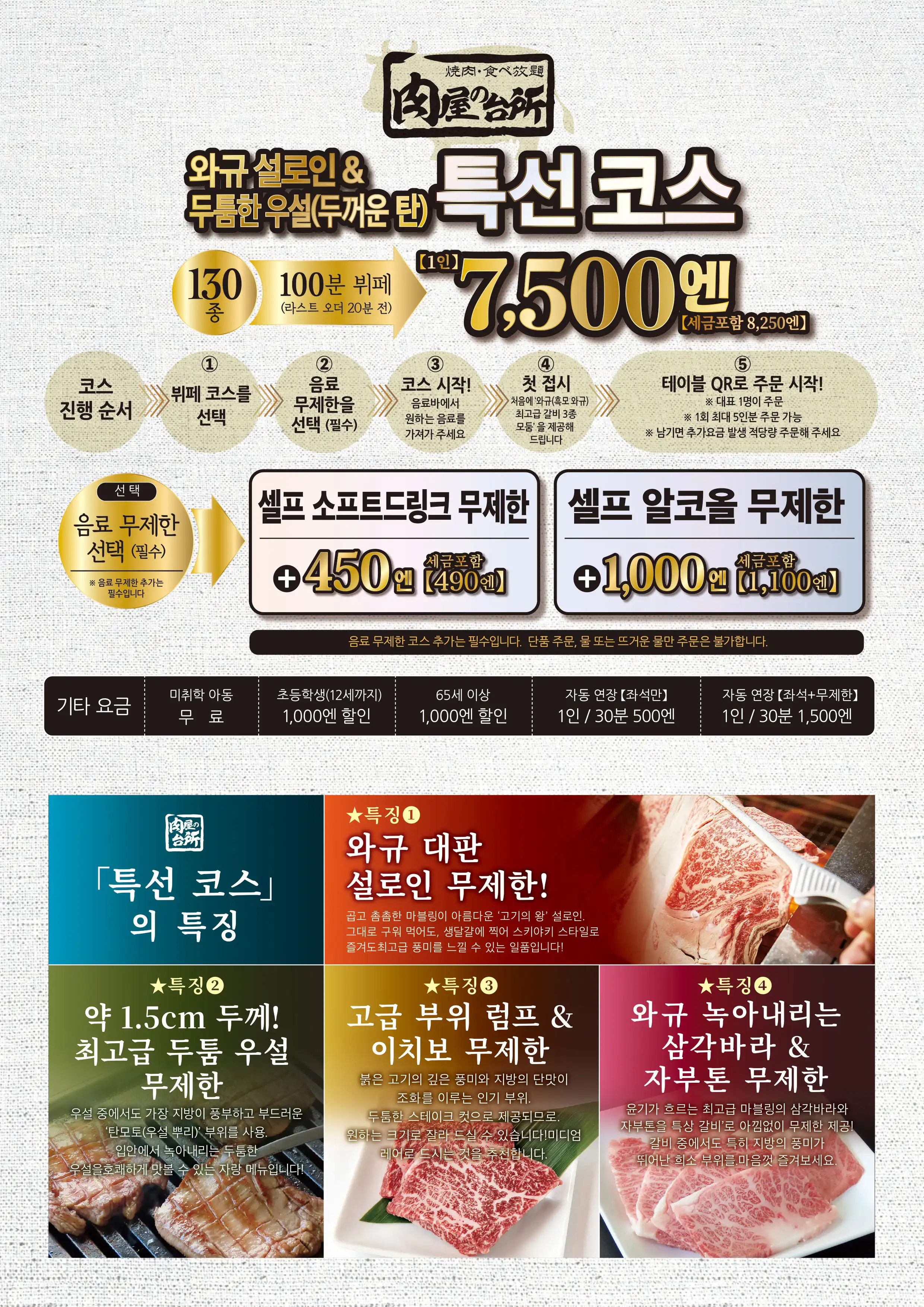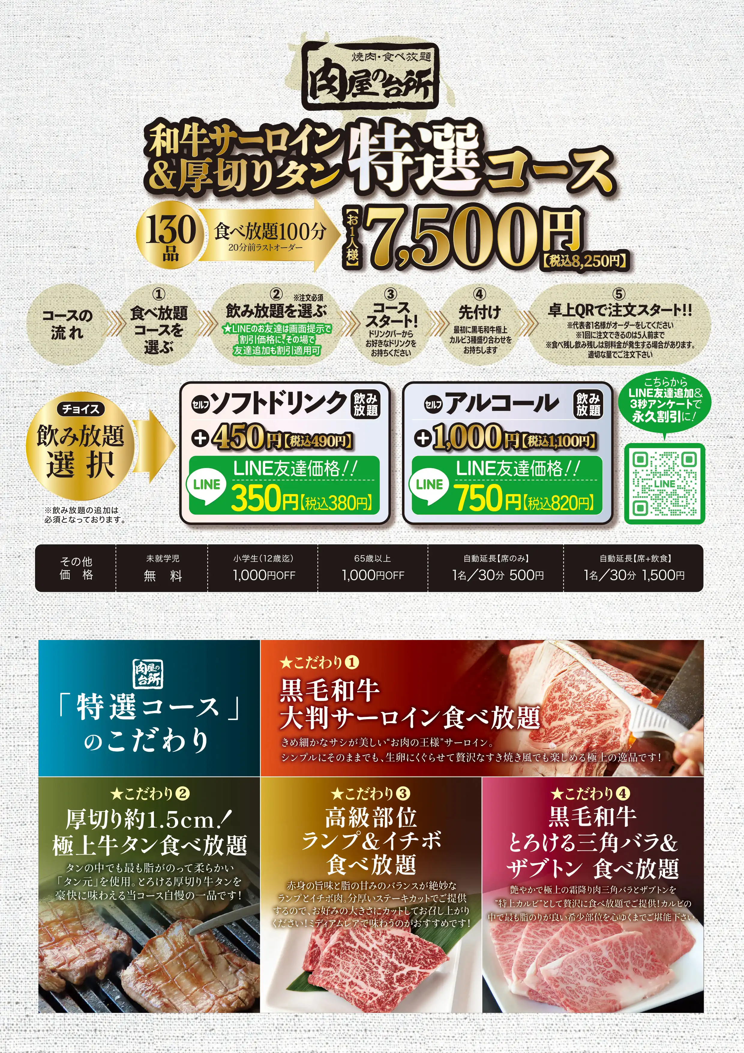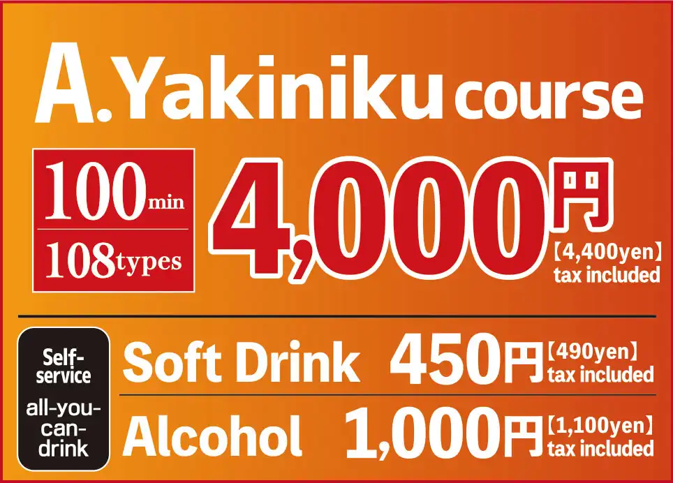 黒毛和牛上カルビや上赤身、名物の黒毛和牛ロング中落カルビなど和牛焼肉をとってもリーズナブルに楽しめる当店の一押し看板コースです。さらに花びらのように盛り付けた和牛肉パフェは事前予約で無料サービスしております。ご希望のメッセージを添えて大切な記念日を彩ります。席時間100分制LO80分ーーーーーーーー【飲み放題料金】※必ずつけていただいており、詳細は当日ご案内させていただきます。(通常価格)ソフトドリンク450円(税込490円)アルコール:1,000円(税込1,100円)(LINE友達価格)ソフトドリンク350円(税込380円)アルコール:750円(税込820円)