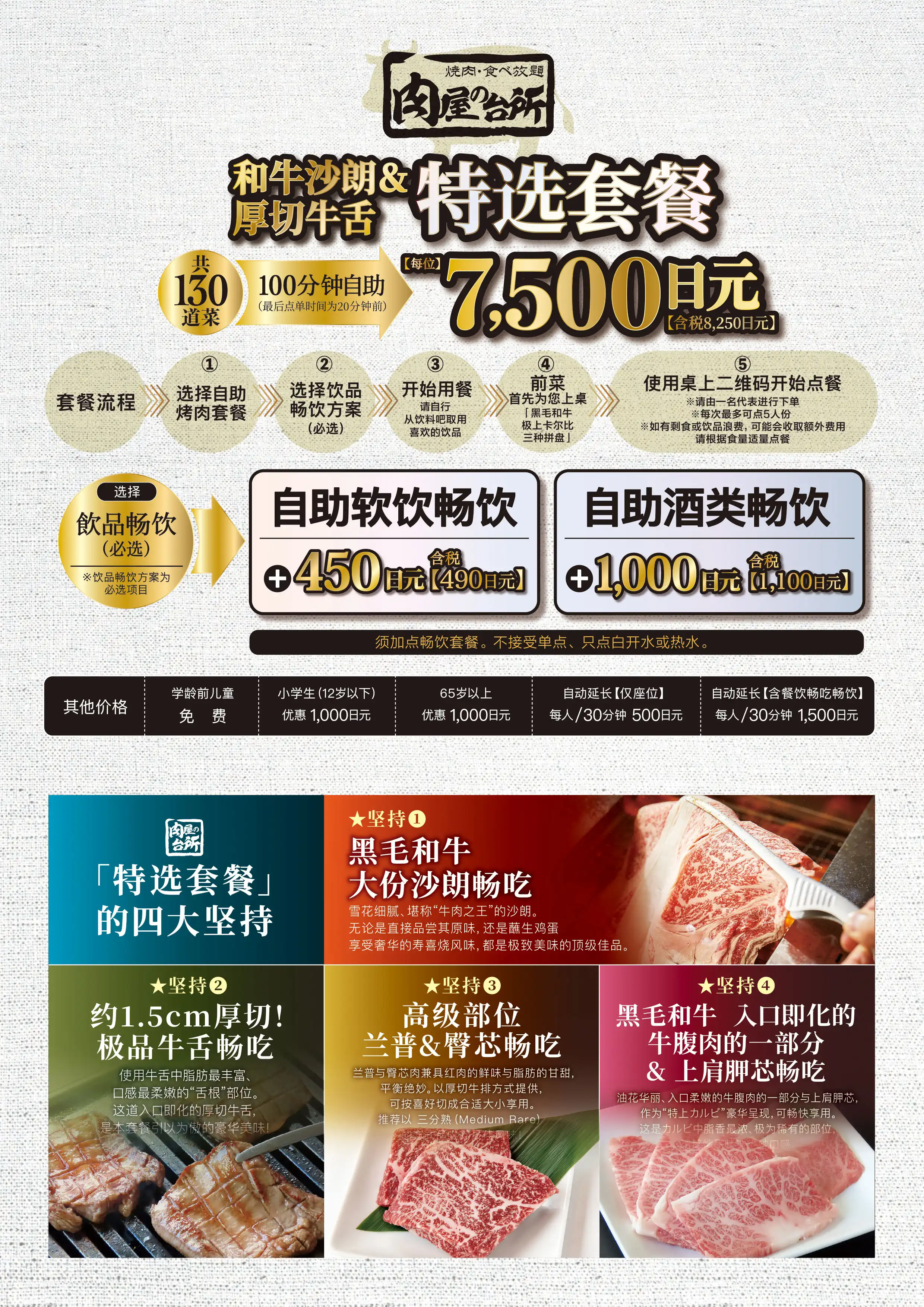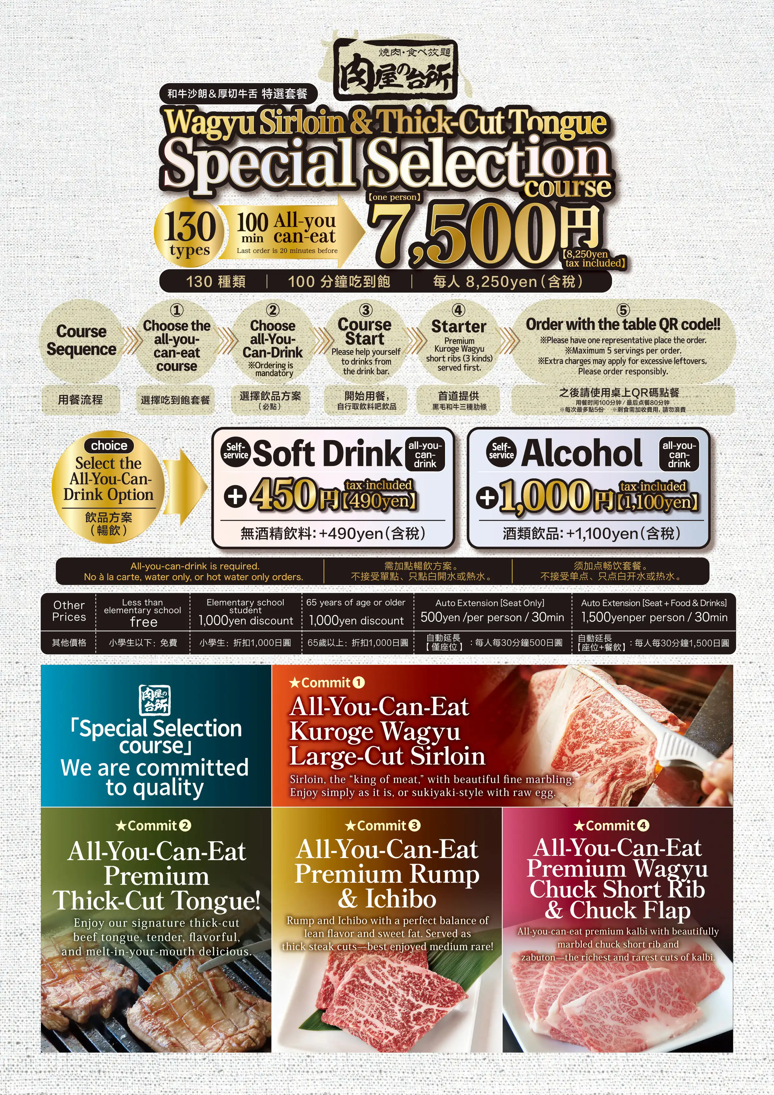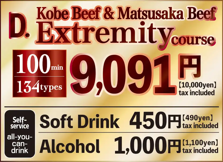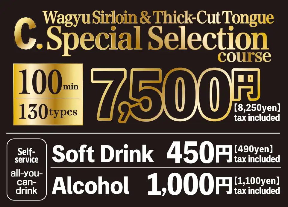 黒毛和牛上カルビや上赤身、名物の黒毛和牛ロング中落カルビなど和牛焼肉をとってもリーズナブルに楽しめる当店の一押し看板コースです。さらに花びらのように盛り付けた和牛肉パフェは事前予約で無料サービスしております。ご希望のメッセージを添えて大切な記念日を彩ります。席時間100分制LO80分ーーーーーーーー【飲み放題料金】※必ずつけていただいており、詳細は当日ご案内させていただきます。(通常価格)ソフトドリンク450円(税込490円)アルコール:1,000円(税込1,100円)(LINE友達価格)ソフトドリンク350円(税込380円)アルコール:750円(税込820円)
