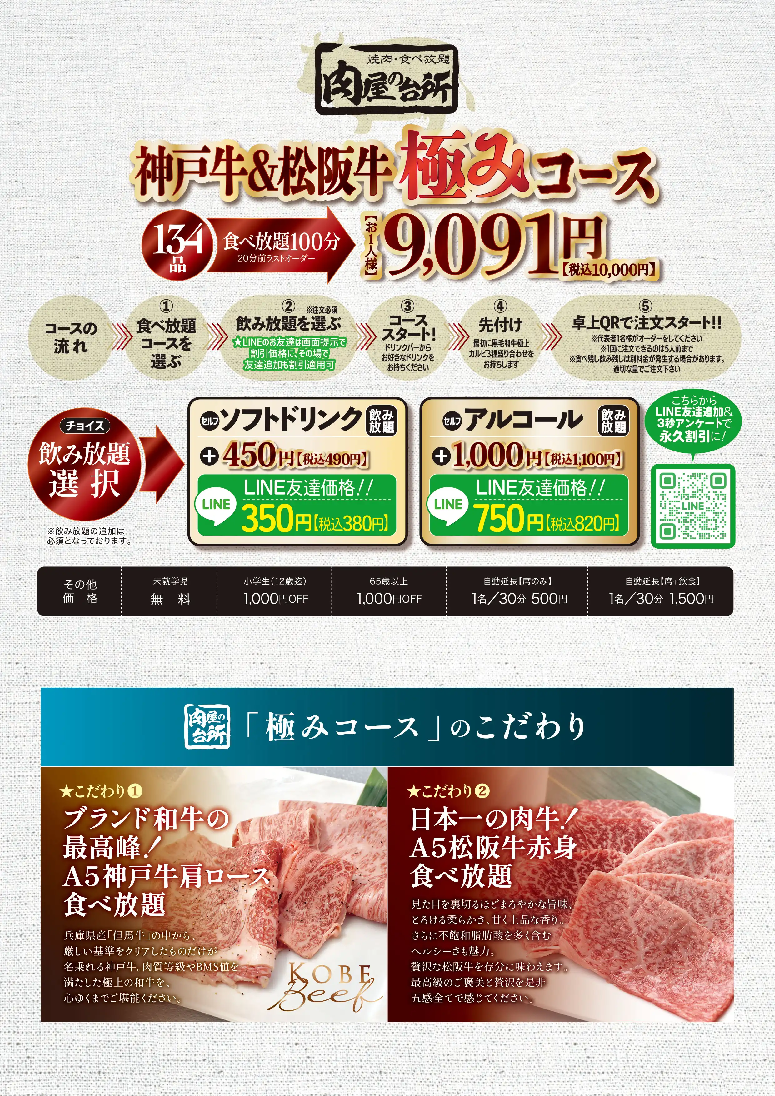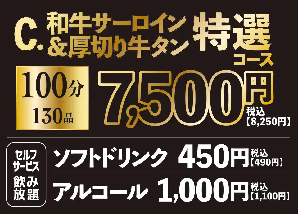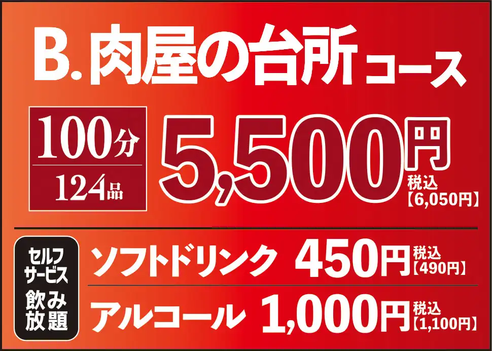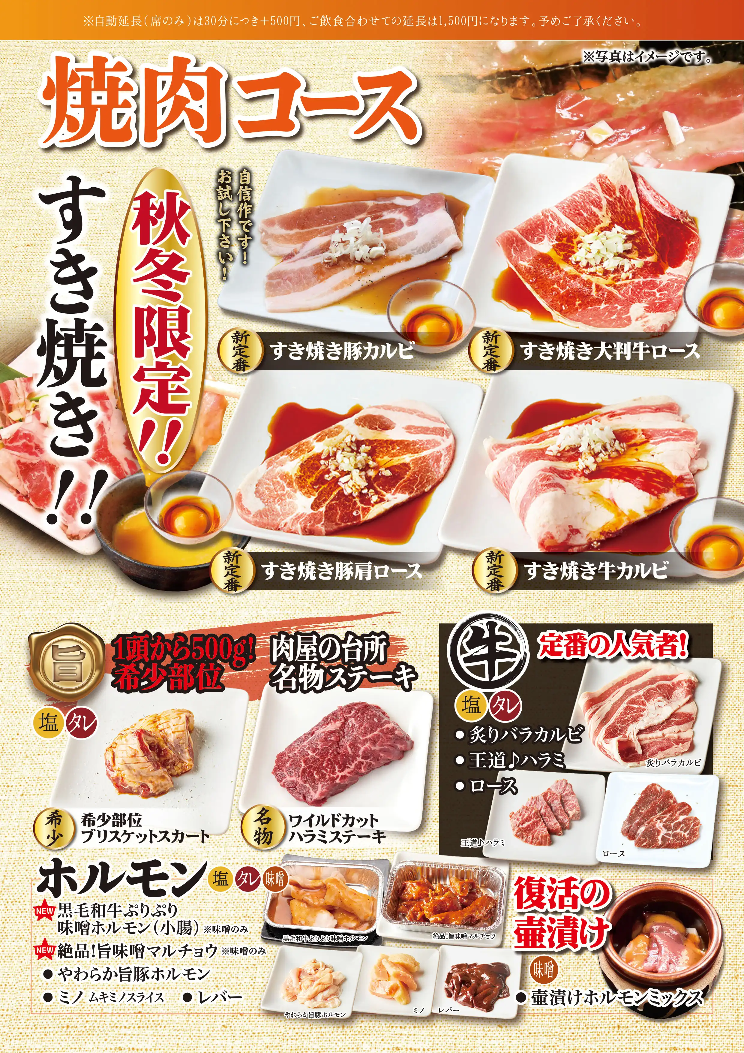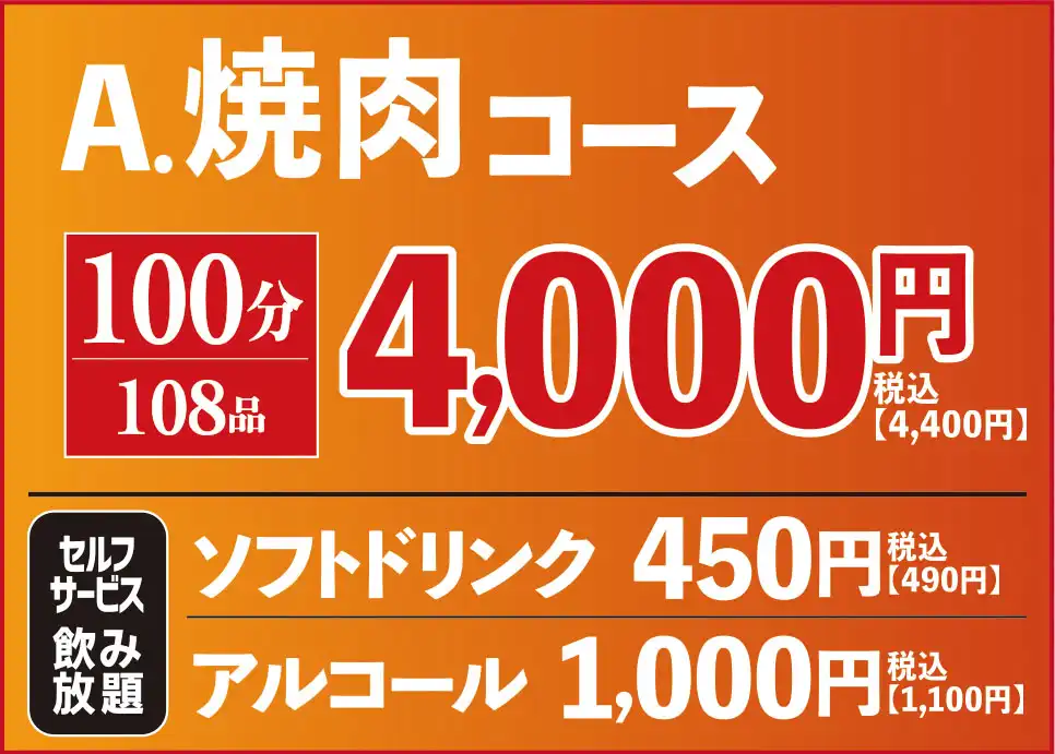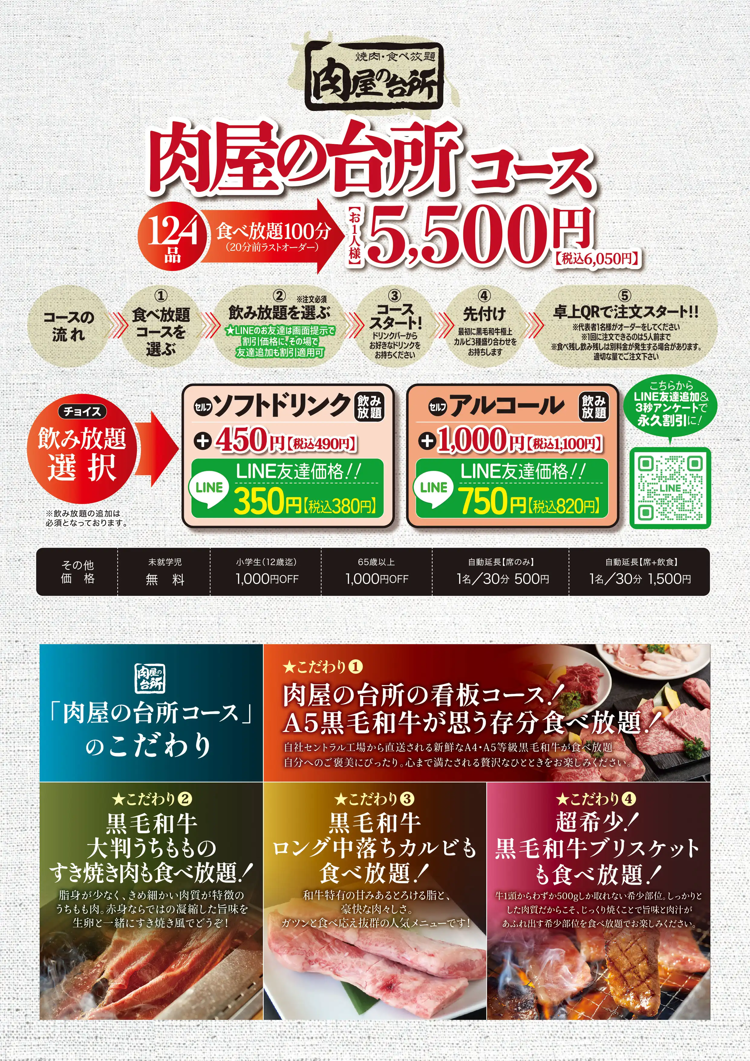 臭みが一切ない黒毛和牛の味噌ホルモンや塊肉の牛ハラミステーキ、この時期おすすめのすき焼き風焼肉などが食べ放題でお楽しみいただけます。ホイル焼きや締めのラーメンなどサイドメニューのバラエティも豊かなコースです。席時間100分制LO80分ーーーーーーーー【飲み放題料金】※必ずつけていただいており、詳細は当日ご案内させていただきます。(通常価格)ソフトドリンク450円(税込490円)アルコール:1,500円(税込1,650円)(LINE友達価格)ソフトドリンク350円(税込380円)アルコール:750円(税込820円)