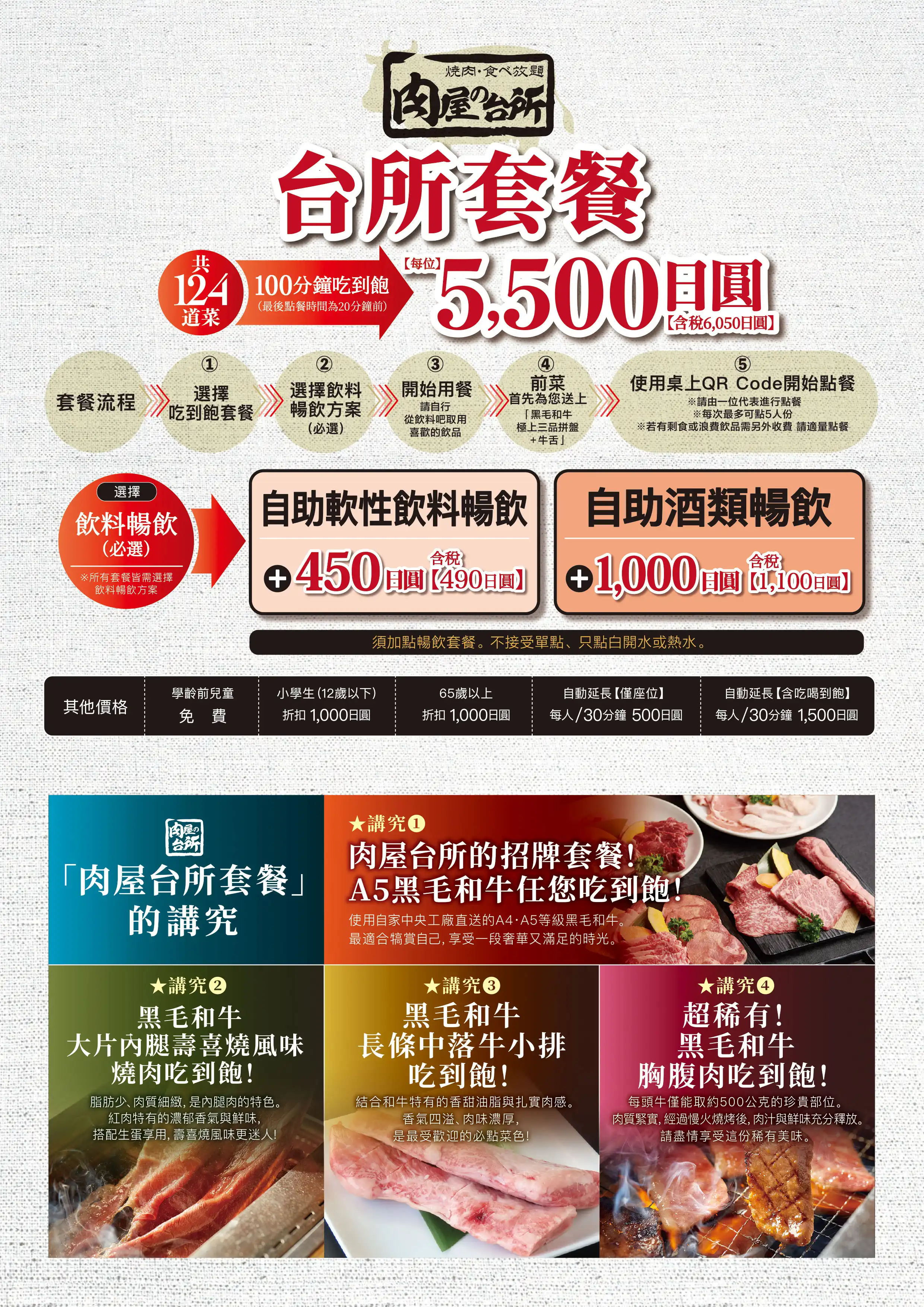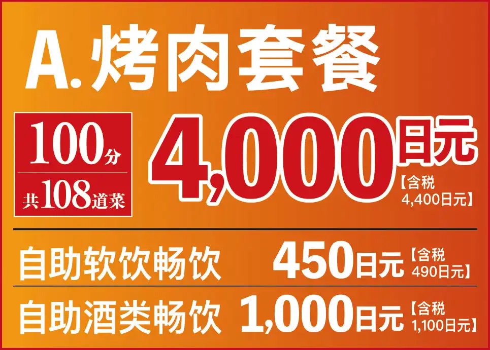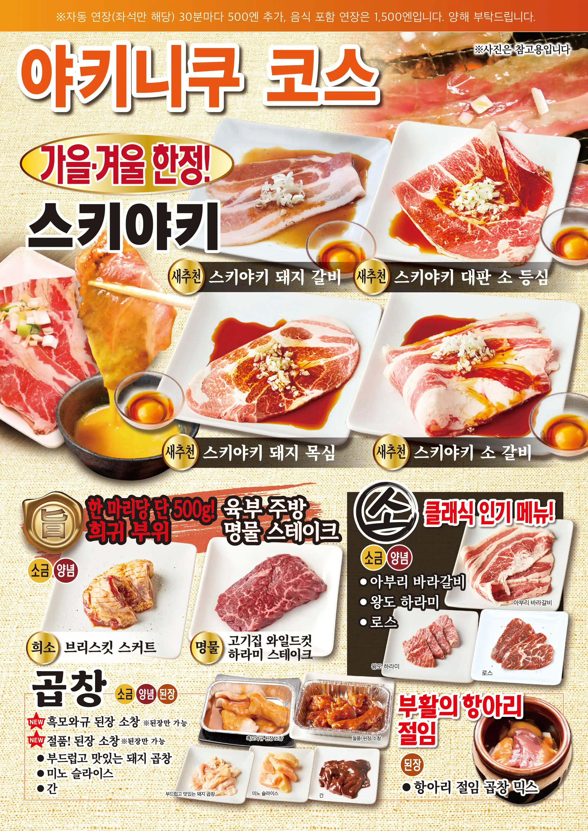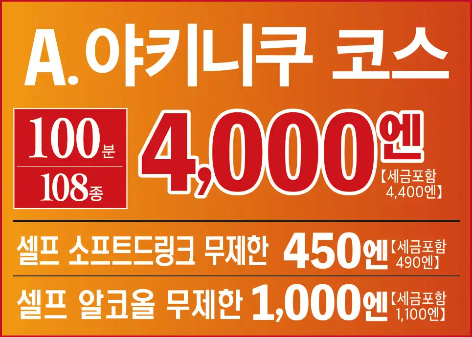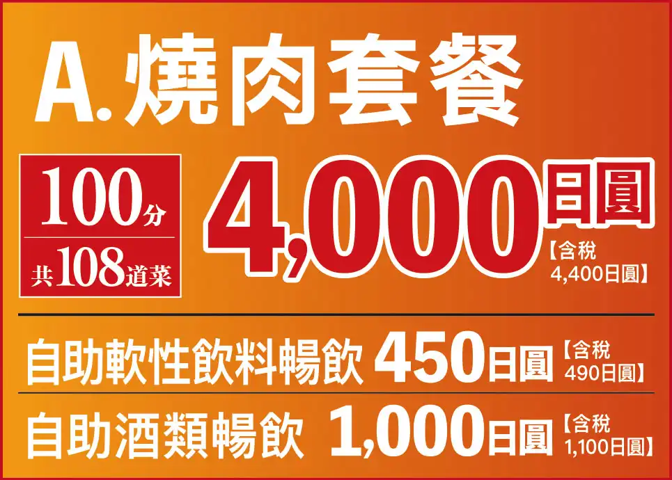 臭みが一切ない黒毛和牛の味噌ホルモンや塊肉の牛ハラミステーキ、この時期おすすめのすき焼き風焼肉などが食べ放題でお楽しみいただけます。ホイル焼きや締めのラーメンなどサイドメニューのバラエティも豊かなコースです。席時間100分制LO80分ーーーーーーーー【飲み放題料金】※必ずつけていただいており、詳細は当日ご案内させていただきます。(通常価格)ソフトドリンク450円(税込490円)アルコール:1,500円(税込1,650円)(LINE友達価格)ソフトドリンク350円(税込380円)アルコール:750円(税込820円)