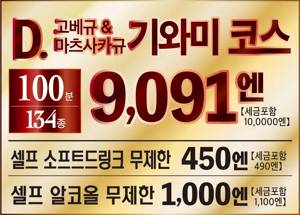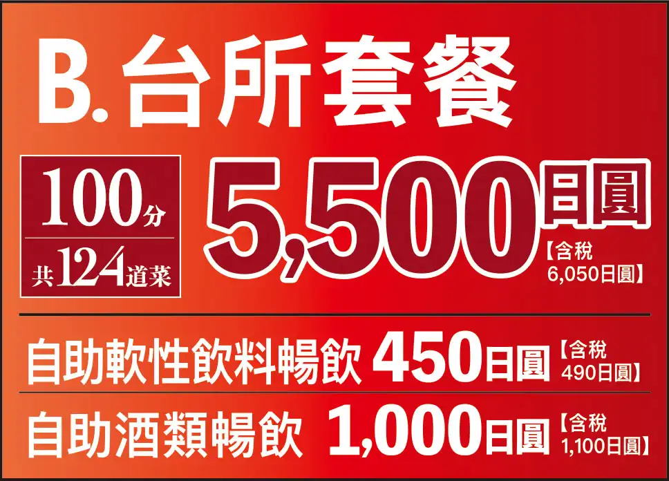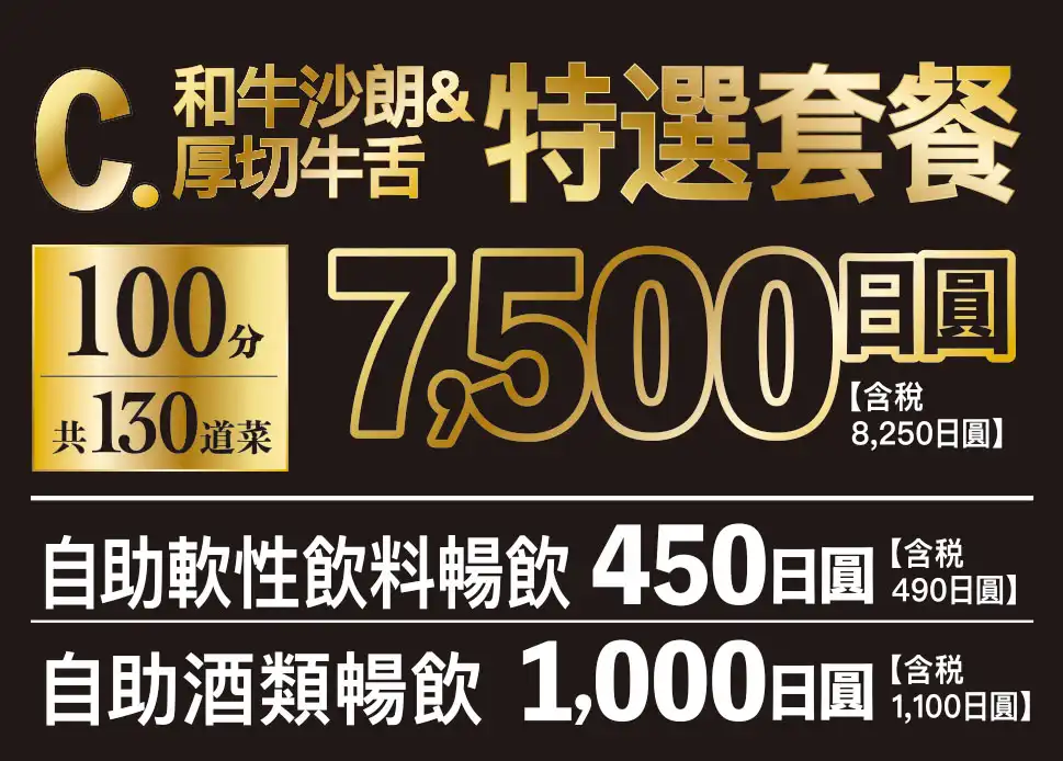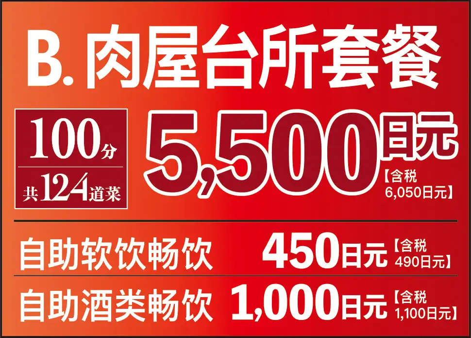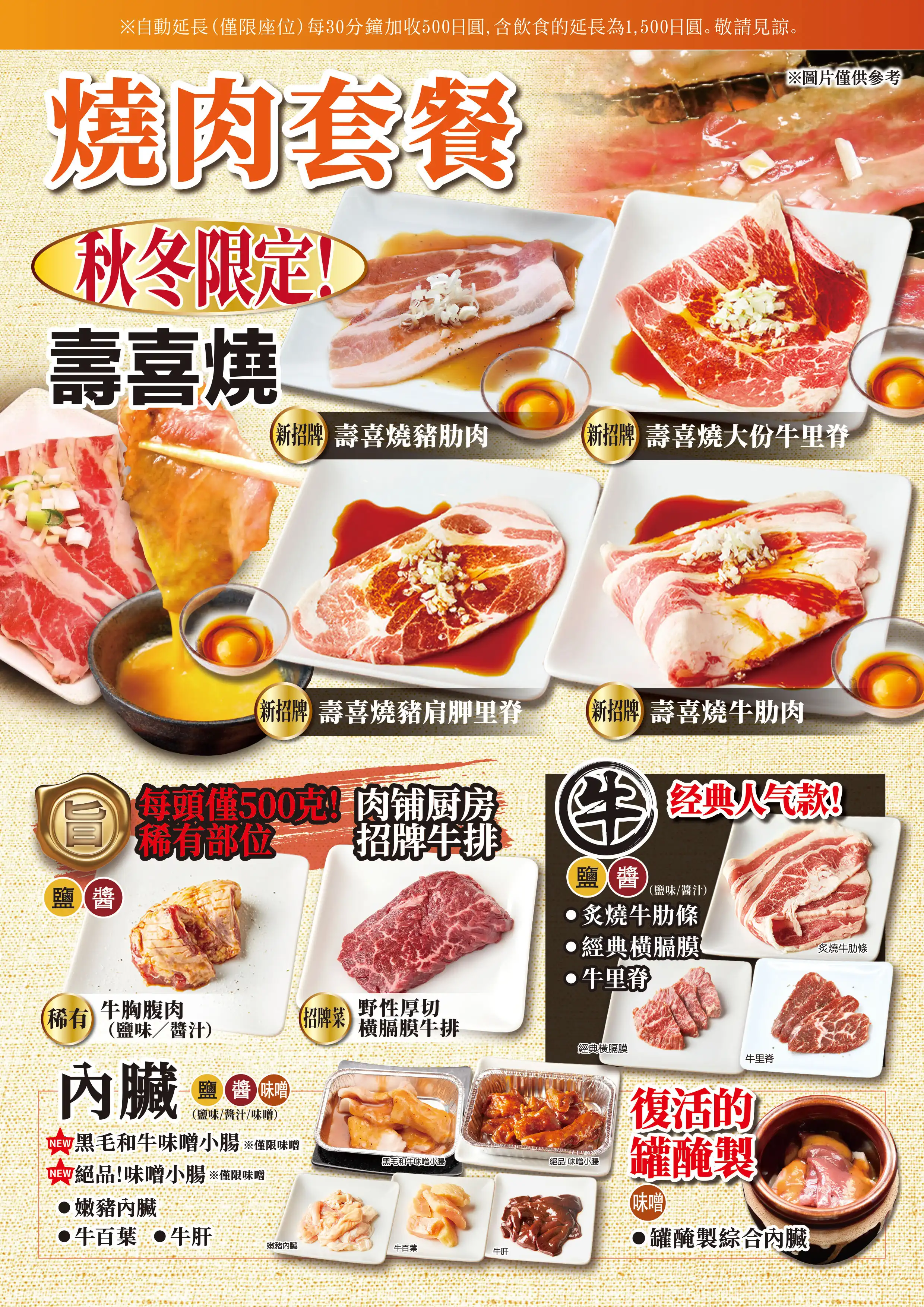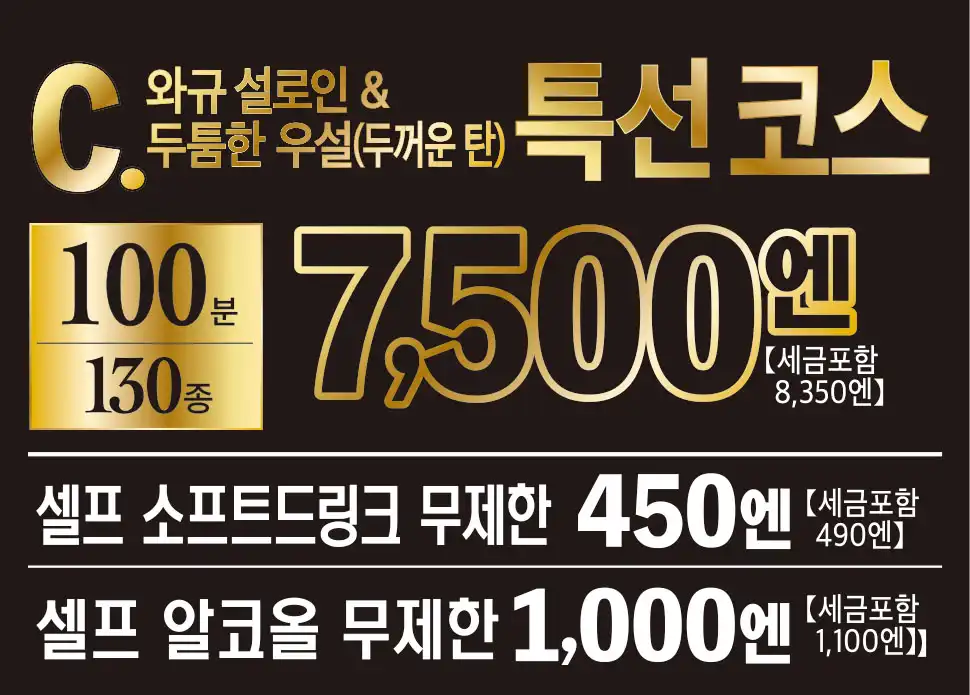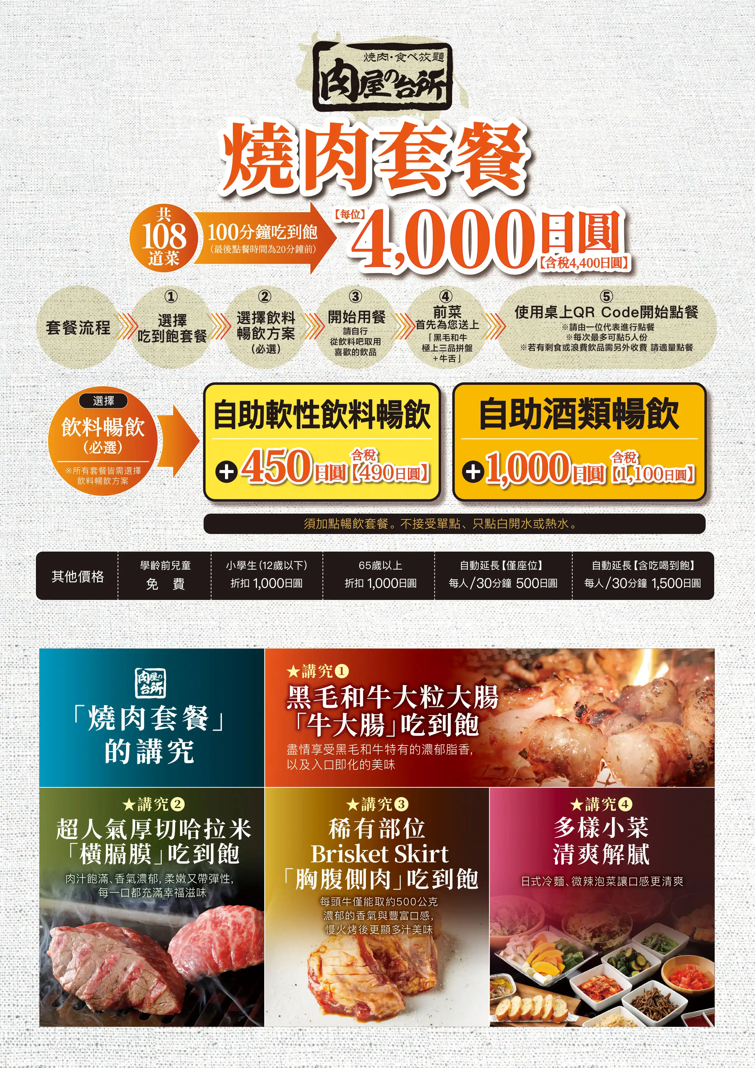 臭みが一切ない黒毛和牛の味噌ホルモンや塊肉の牛ハラミステーキ、この時期おすすめのすき焼き風焼肉などが食べ放題でお楽しみいただけます。ホイル焼きや締めのラーメンなどサイドメニューのバラエティも豊かなコースです。席時間100分制LO80分ーーーーーーーー【飲み放題料金】※必ずつけていただいており、詳細は当日ご案内させていただきます。(通常価格)ソフトドリンク450円(税込490円)アルコール:1,500円(税込1,650円)(LINE友達価格)ソフトドリンク350円(税込380円)アルコール:750円(税込820円)