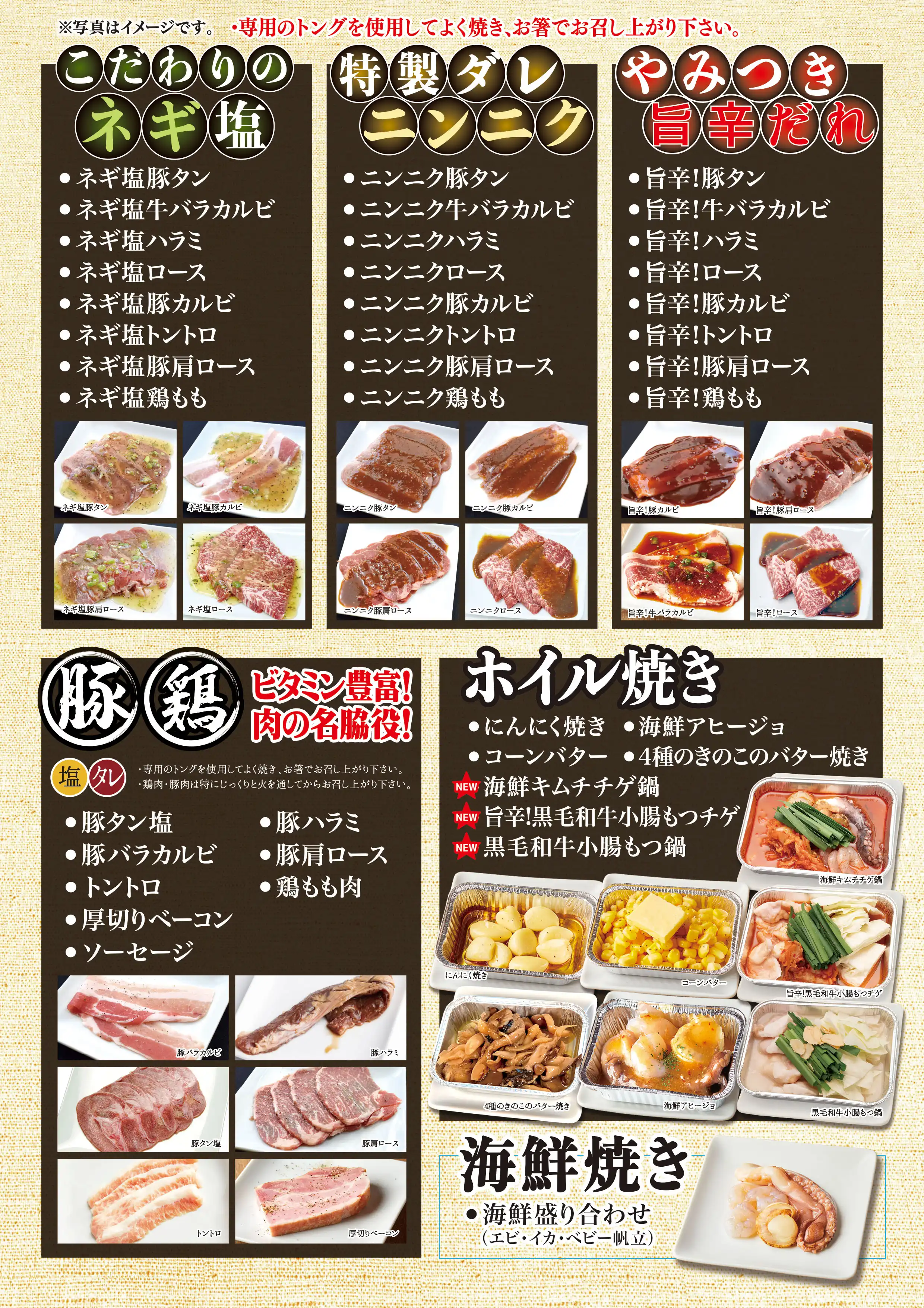 | コース内容 | 【 A5和牛希少部位 】 和牛ランプ・イチボ 和牛大判サーロイン 和牛特上カルビ(三角バラ/サブトン) 【 A5黒毛和牛 】 極上カルビ3種盛り合わせ (三角ばら/ザブトン/上カルビ/ブリスケ)うち三種 和牛ロング中落カルビ 和牛上カルビ 和牛ブリスケットスカート 和牛上赤身 和牛シンタマ 和牛大判うちもも肉 和牛ぷりぷり味噌ホルモン(小腸) 【1頭から500gの希少部位】 希少部位ブリスケットスカート 【秋冬限定すき焼き風焼肉】 和牛大判うちもも肉 牛カルビ 大判牛ロース 豚カルビ 豚肩ロース 【牛肉】 ワイルドカットハラミステーキ 厚切り牛タン 以下商品選べるソース(塩/タレ/ニンニクだれ/ねぎ塩だれ/旨辛ダレ) 牛タン 牛ハラミ 炙りバラカルビ 大判ロース 【ホルモン】 黒毛和牛ぷりぷり味噌ホルモン(小腸) 壺漬けホルモンミックス やわらか旨豚ホルモン ムキミノスライス 絶品!旨味噌マルチョウ レバー 【豚・鶏】 味付け豚ハラミ 以下商品選べるソース(塩/タレ/ニンニクだれ/ねぎ塩だれ/旨辛ダレ) 豚タン 豚バラカルビ 豚肩ロース トントロ 鶏もも 【サイドメニュー】 厚切りベーコン ソーセージ 白菜キムチ カクテキ キムチ盛り合わせ オイキムチ ナムルミックス シーザーサラダ 肉屋の台所特製塩ごまだれサラダ 蒸し鶏ゴマダレサラダ まき野菜 塩だれキャベツ ポテトサラダ 韓国のり おつまみうずら チヂミ おつまみメンマ 【ホイル焼き】 にんにく焼き 4種のきのこのバター焼き コーンバター 海鮮アヒージョ 【〆・ご飯もの】 肉屋の自家製肉味噌ビビンバ ごはん 肉屋台所カレー 一口冷麺(梅味) 一口冷麺 コムタンスープ 海鮮キムチチゲ鍋 旨辛!黒毛和牛小腸もつチゲ 黒毛和牛小腸もつ鍋 ピリ辛チゲラーメン 貝出汁香る魚介塩ラーメン 【肉屋のTKGシリーズ】 肉屋のTKG しょうゆ 肉屋のTKG塩 肉屋の自家製肉味噌TKG 肉屋のTKGネギ油 【焼き野菜】 焼き野菜盛り合わせ 【海鮮焼き】 海鮮盛り合せ(エビ・イカ・ホタテ) 【デザート】 杏仁豆腐 フルーツポンチ 豪華パフェアイス★1人1つ (抹茶バニラ/マンゴーバニラ/チョコバニラ) |