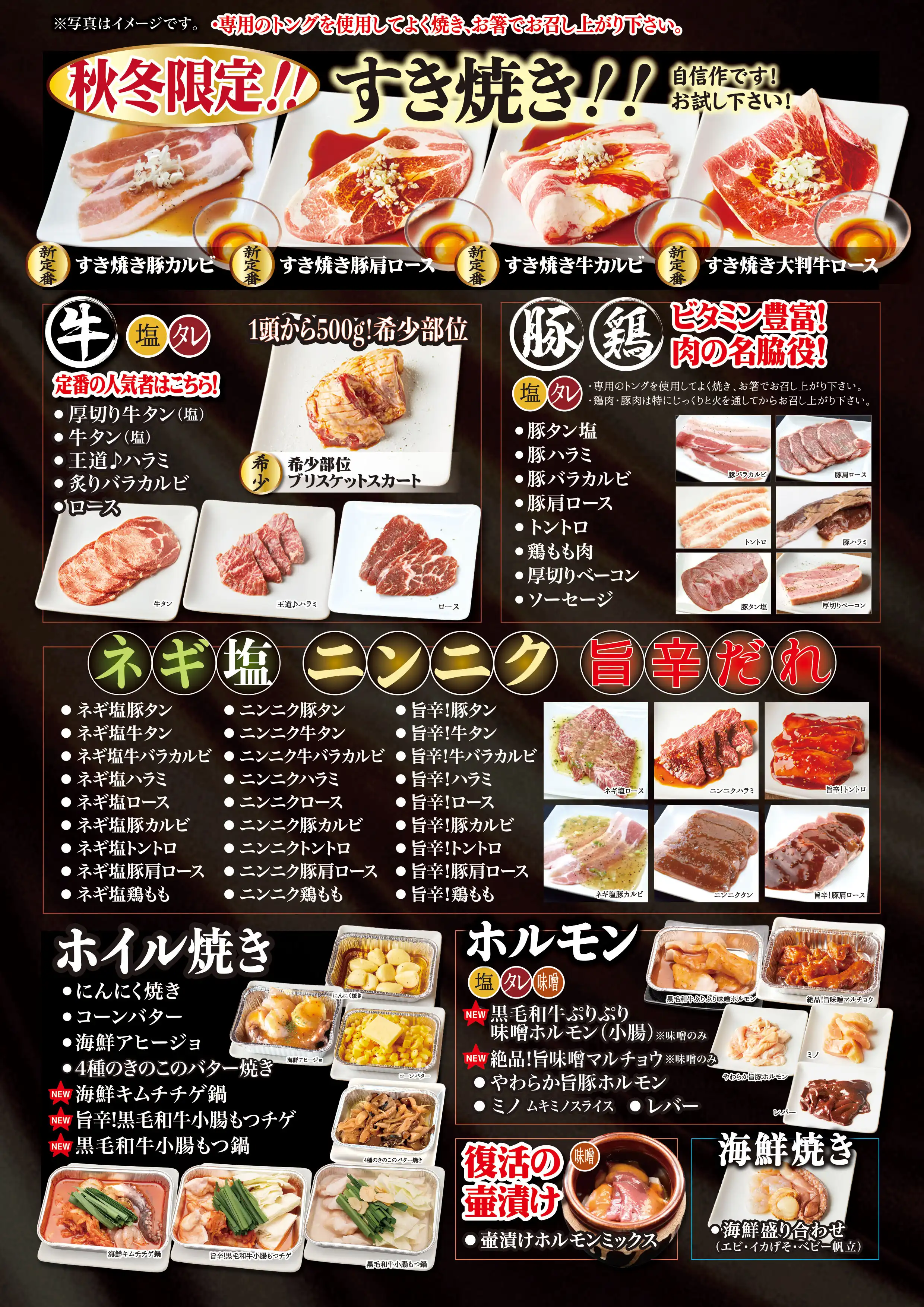 | コース内容 | 【 A5黒毛和牛 】 極上カルビ3種盛り合わせ (三角ばら/ザブトン/上カルビ/ブリスケ)うち三種 和牛ロング中落カルビ 和牛上カルビ 和牛ブリスケットスカート 和牛上赤身 和牛シンタマ 和牛大判うちもも肉 和牛ぷりぷり味噌ホルモン(小腸) 【1頭から500gの希少部位】 希少部位ブリスケットスカート 【秋冬限定すき焼き風焼肉】 和牛大判うちもも肉 牛カルビ 大判牛ロース 豚カルビ 豚肩ロース 【牛肉】 ワイルドカットハラミステーキ 以下商品選べるソース(塩/タレ/ニンニクだれ/ねぎ塩だれ/旨辛ダレ) 牛タン 牛ハラミ 炙りバラカルビ 大判ロース 【ホルモン】 黒毛和牛ぷりぷり味噌ホルモン(小腸) 壺漬けホルモンミックス やわらか旨豚ホルモン ムキミノスライス 絶品!旨味噌マルチョウ レバー 【豚・鶏】 味付け豚ハラミ 以下商品選べるソース(塩/タレ/ニンニクだれ/ねぎ塩だれ/旨辛ダレ) 豚タン 豚バラカルビ 豚肩ロース トントロ 鶏もも 【サイドメニュー】 厚切りベーコン ソーセージ 白菜キムチ カクテキ キムチ盛り合わせ オイキムチ ナムルミックス シーザーサラダ 肉屋の台所特製塩ごまだれサラダ 蒸し鶏ゴマダレサラダ まき野菜 塩だれキャベツ ポテトサラダ 韓国のり おつまみうずら チヂミ おつまみメンマ 【ホイル焼き】 にんにく焼き 4種のきのこのバター焼き コーンバター 海鮮アヒージョ 【〆・ご飯もの】 肉屋の自家製肉味噌ビビンバ ごはん 肉屋台所カレー 一口冷麺(梅味) 一口冷麺 コムタンスープ 海鮮キムチチゲ鍋 旨辛!黒毛和牛小腸もつチゲ 黒毛和牛小腸もつ鍋 ピリ辛チゲラーメン 貝出汁香る魚介塩ラーメン 【肉屋のTKGシリーズ】 肉屋のTKG しょうゆ 肉屋のTKG塩 肉屋の自家製肉味噌TKG 肉屋のTKGネギ油 【焼き野菜】 焼き野菜盛り合わせ 【海鮮焼き】 海鮮盛り合せ(エビ・イカ・ホタテ) 【デザート】 杏仁豆腐 フルーツポンチ 豪華パフェアイス★1人1つ (抹茶バニラ/マンゴーバニラ/チョコバニラ) |