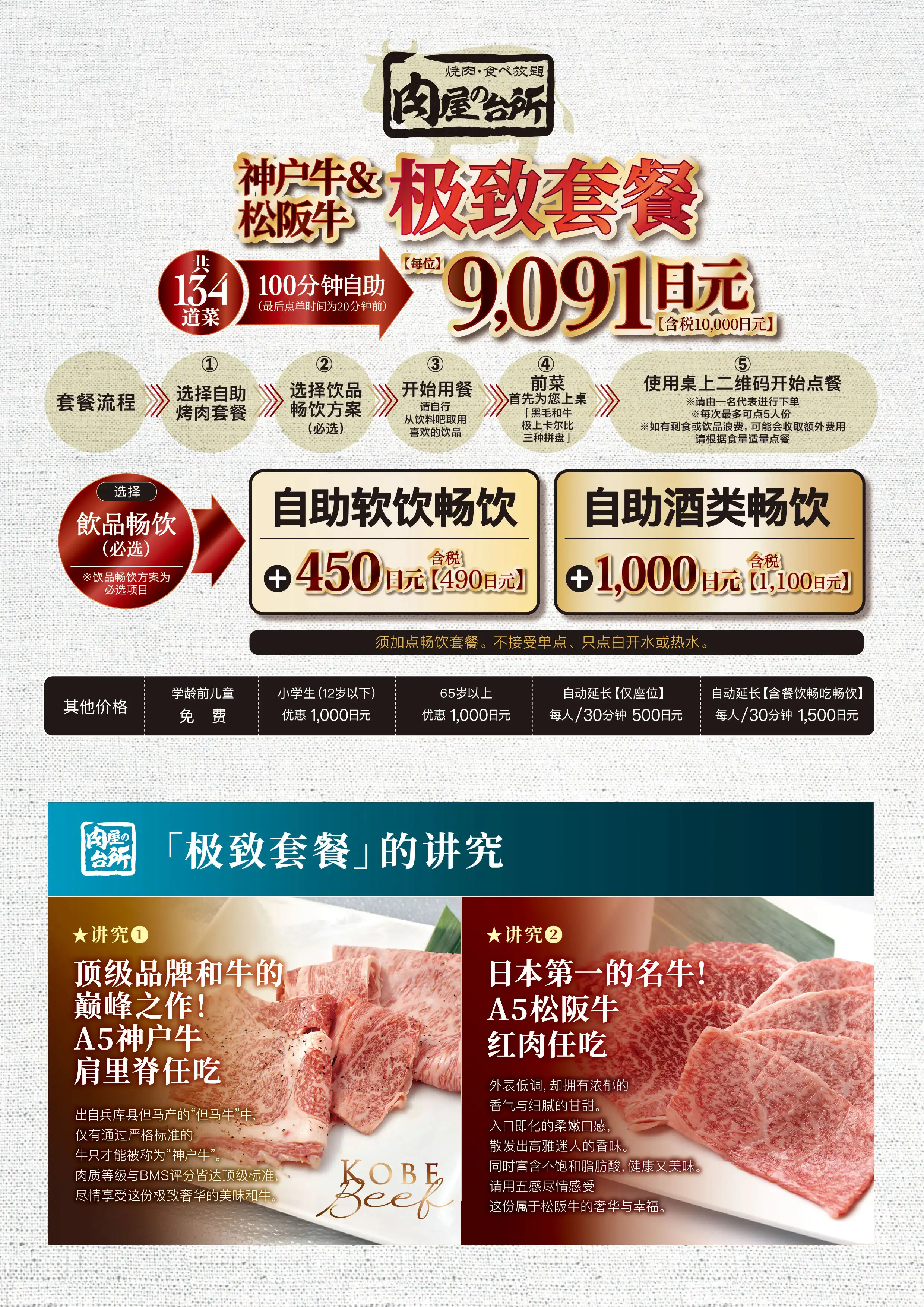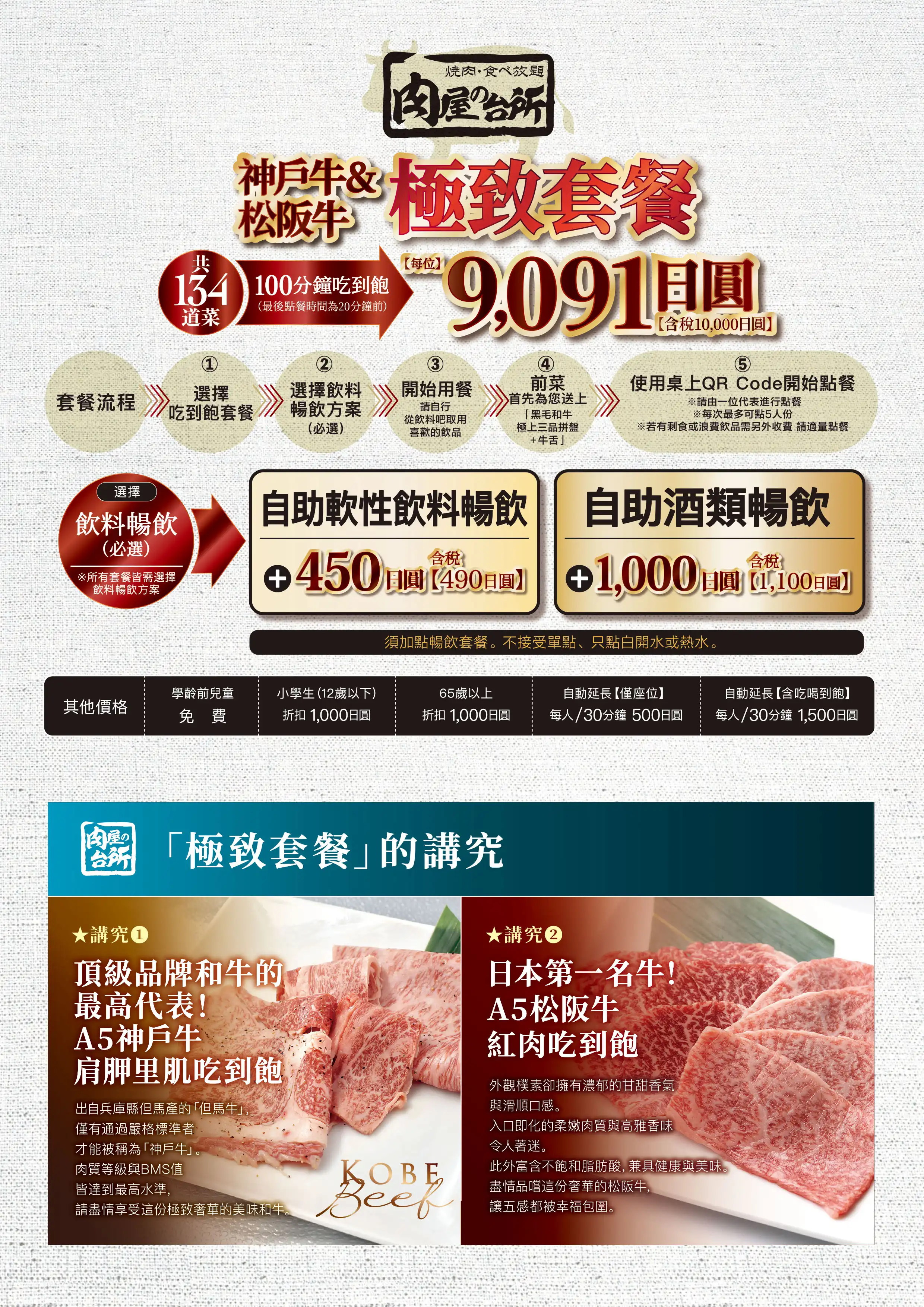 神戸牛は但馬牛の系統で「繊細で美しい霜降り」が特徴。松阪牛は「濃厚な旨みととろけるような甘み」が特徴のともに最高級ブランド和牛です。事前予約で和牛肉パフェを無料サービスしております。ご希望のメッセージを添えて大切な記念日を彩ります。席時間100分制LO80分ーーーーーーーー【飲み放題料金】※必ずつけていただいており、詳細は当日ご案内させていただきます。(通常価格)ソフトドリンク450円(税込490円)アルコール:1,000円(税込1,100円)(LINE友達価格)ソフトドリンク350円(税込380円)アルコール:750円(税込820円)
